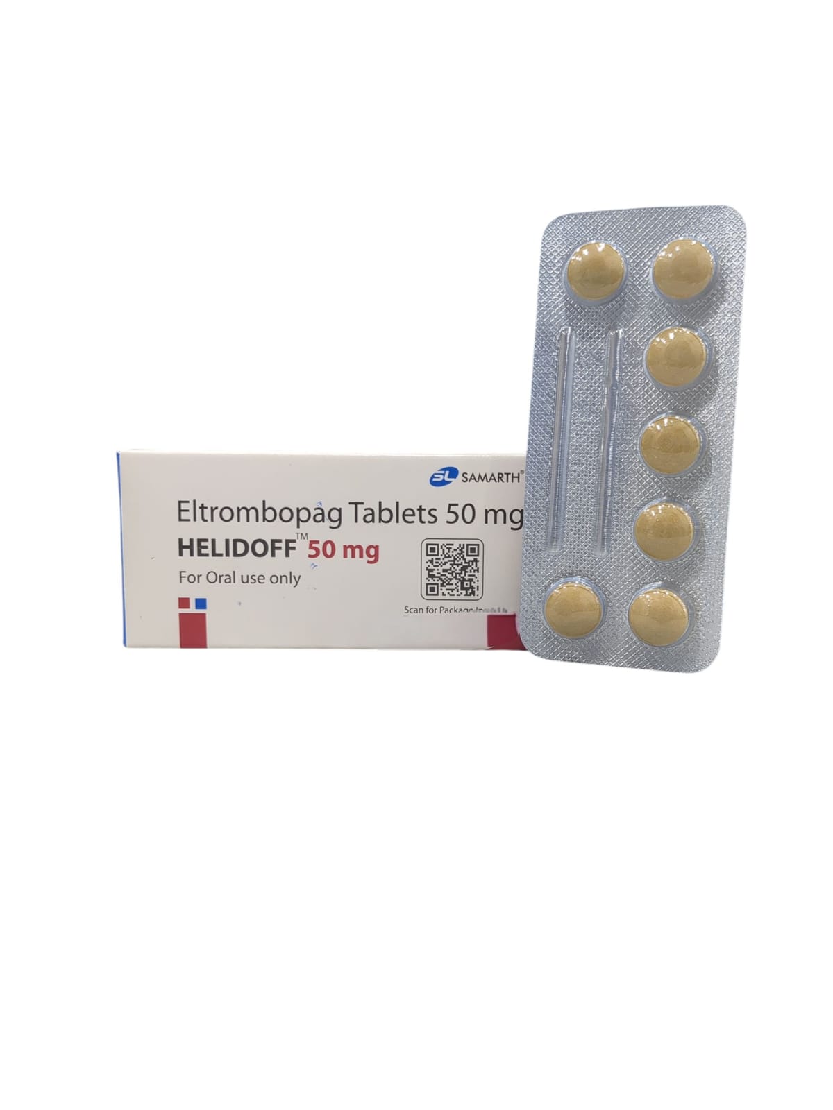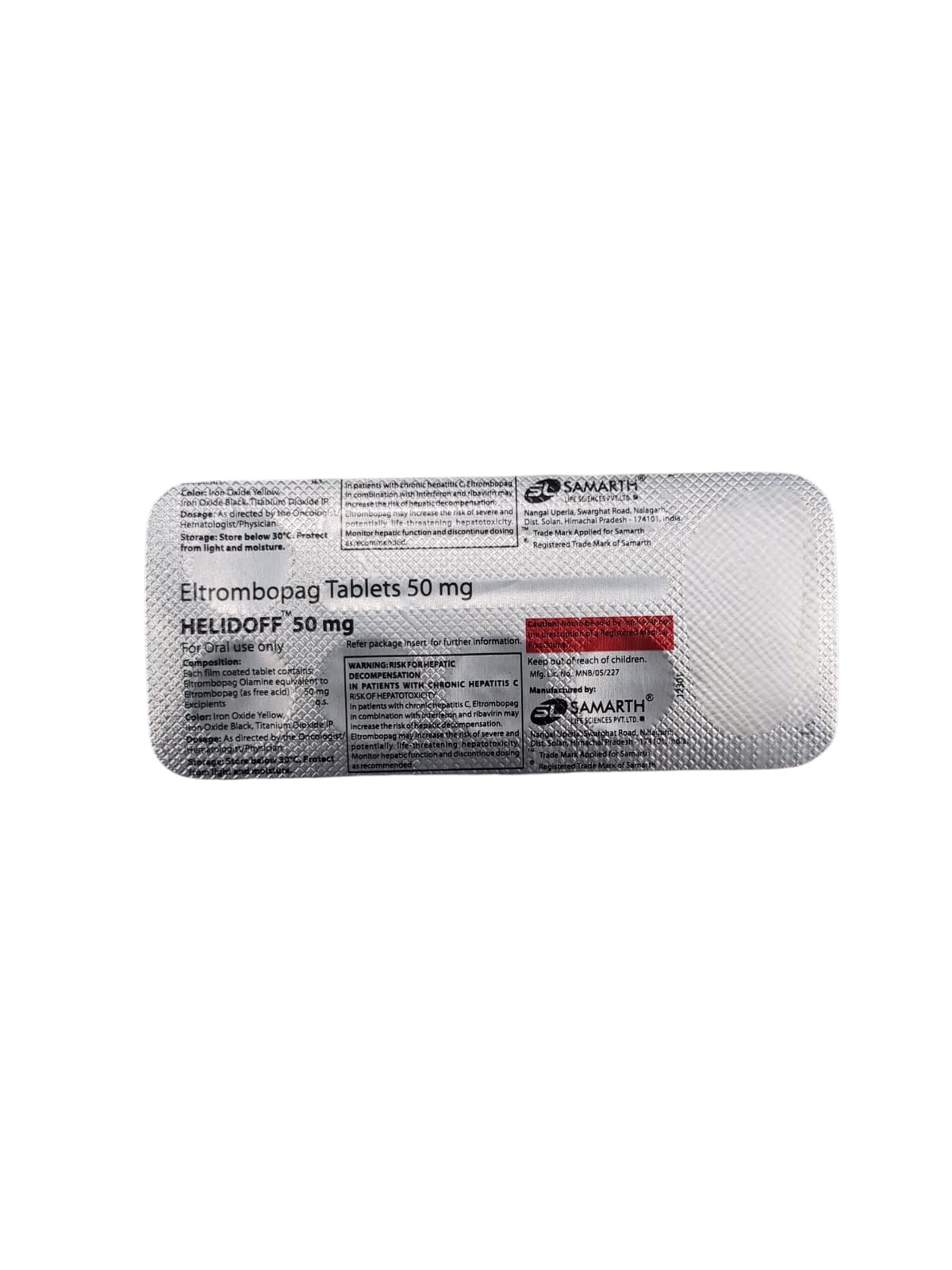 Helidoff 50mg Tablet is an anticoagulant drug belonging to the thrombopoietin (TPO) receptor agonist category, containing the active ingredient Eltrombopag. It treats low platelet counts caused by primary immune thrombocytopenia (ITP) or hepatitis C (HCV) infection. ITP refers to an autoimmune disorder in which the immune system destroys platelets. Platelets are blood cells that aid in clotting and protect blood vessel walls. When platelet levels are low, it can result in severe bleeding and bruising. This tablet is also used in adults to treat low blood counts caused by severe aplastic anaemia (a serious blood disease that occurs when the bone marrow fails to produce enough new blood cells).
