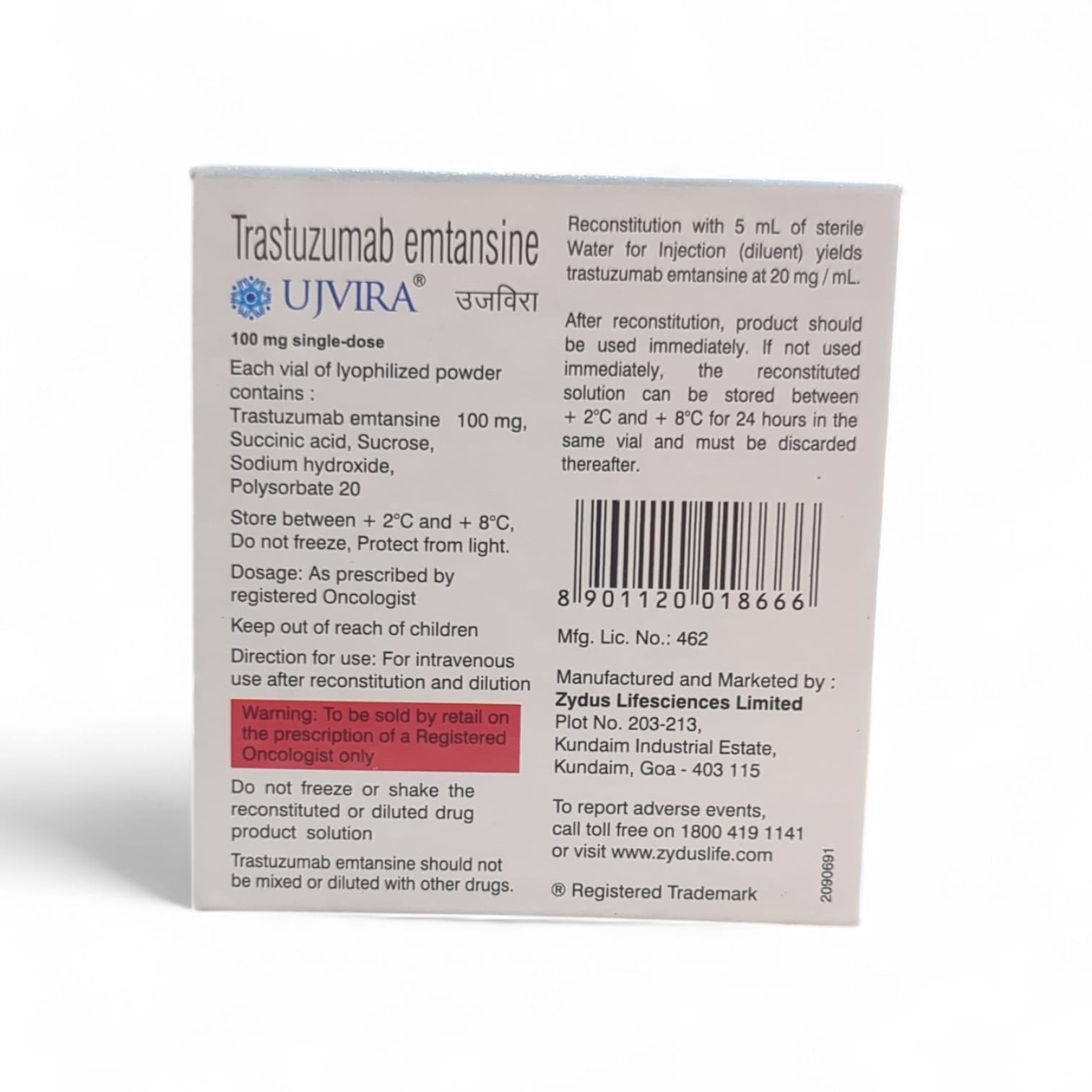 Ujvira 100mg Injection is a targeted therapy containing the active constituent trastuzumab emtansine. The U.S. Food and Drug Administration (FDA) approved trastuzumab emtansine on February 22, 2013, for treating patients with HER2-positive metastatic breast cancer who have previously received trastuzumab and chemotherapy. This medication is not recommended for adolescents and children under 18. Before taking this medicine, it is vital to inform your doctor if you have any blood clot disorders, liver disorders, or allergies.