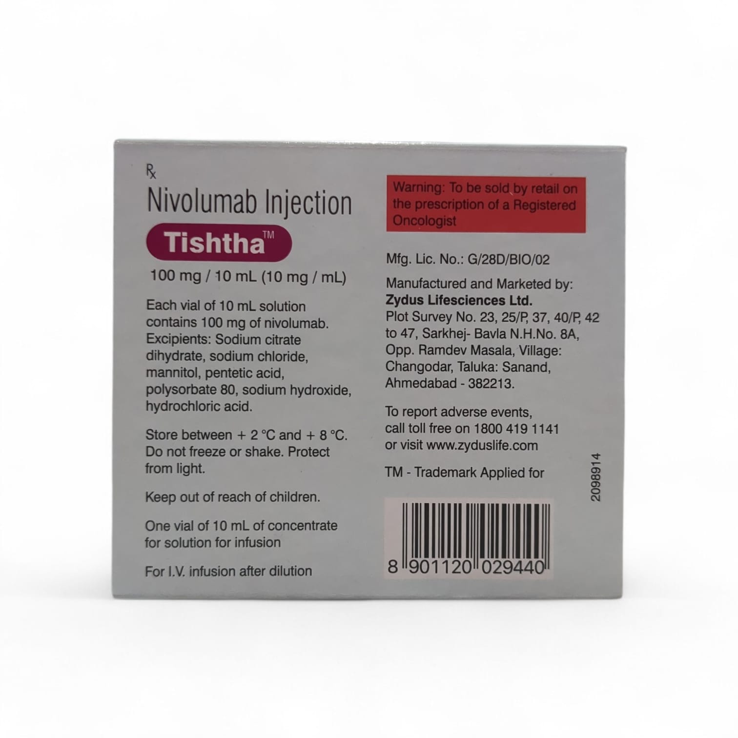 Tishtha 100mg Injection consists of the active substance Nivolumab. It is indicated to treat cancers of the skin, lungs, kidney, lymph node, bladder, esophagus, and urinary tract.